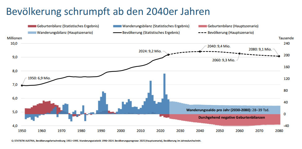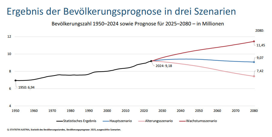 In den nachfolgenden Jahren soll die Bevölkerungszahl nach und nach sinken und 2080 im „Hauptszenario“ schließlich bei 9,07 Millionen liegen. 2025 leben in Österreich 9,21 Millionen Menschen.