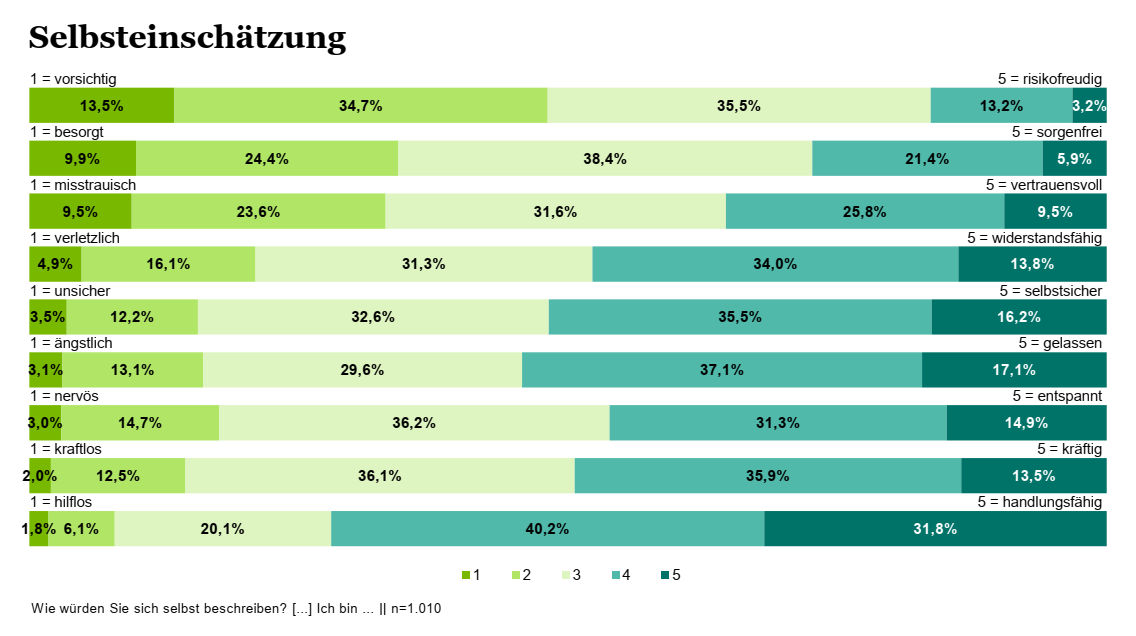 Als „(eher) besorgt“ bezeichnet sich zirka ein Drittel, nur etwas mehr als ein Viertel fühlt sich „(eher) sorgenfrei“. Fast vier von zehn Befragten positionieren sich zwischen diesen beiden Gruppen.