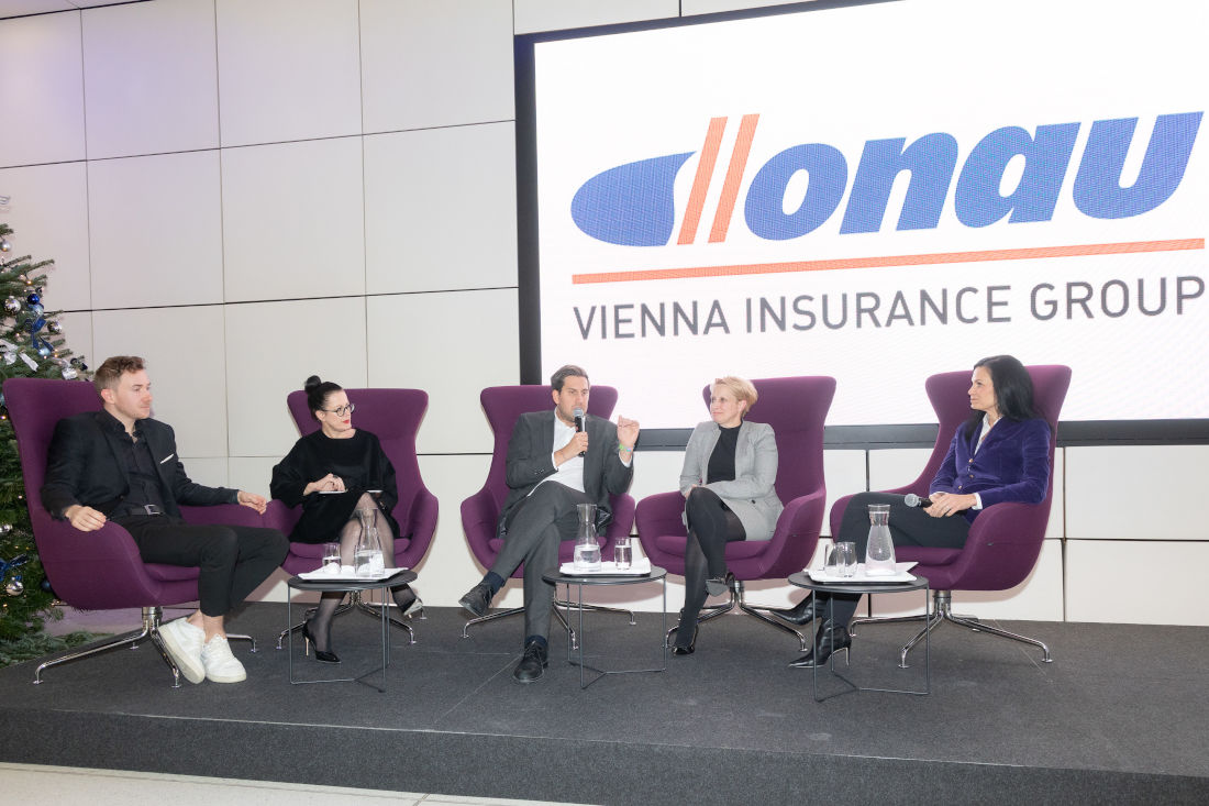 Zukunftsforscher Tristan Horx, Erste-Vorstandsvorsitzende Gerda Holzinger-Burgstaller, Staatssekretär Alexander Pröll, Donau-Vorstandsvorsittzende Judit Havasi und Moderatorin Silvia Grünberger (Bild: Donau/APA-Fotoservice/Tanzer)