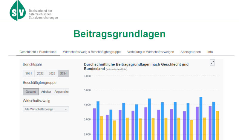 Der Dachverband der Sozialversicherungsträger hat ein neues Online-Daten-Dashboard eingerichtet. Die öffentlich frei zugängliche Website zeigt in Diagrammen aufbereitete Daten aus der Beitragsgrundlagenstatistik der unselbstständig Beschäftigten.