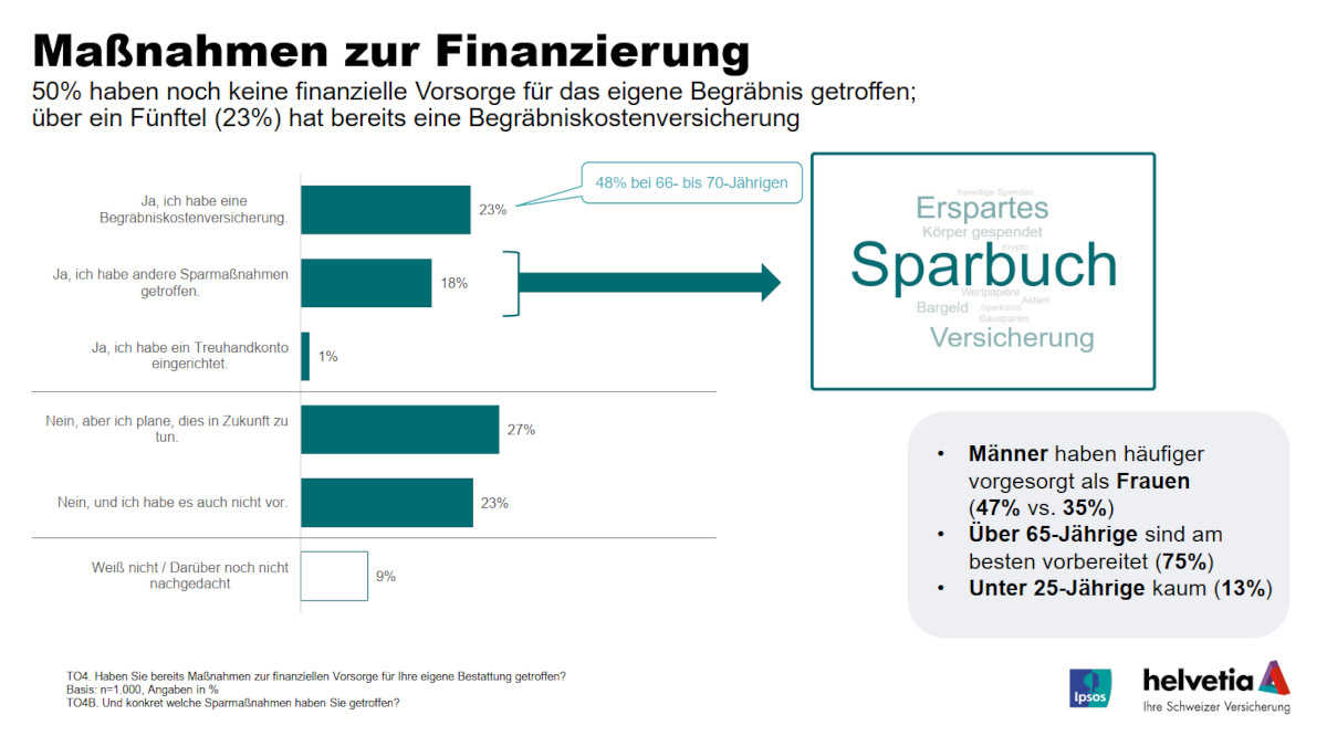 Auf die Frage, ob bereits finanzielle Vorsorge getroffen wurde, gaben nur 23 Prozent an, bereits eine Begräbniskostenversicherung zu haben – wobei der Anteil In der Gruppe der 66- bis 70-Jährigen etwa doppelt so hoch ist.